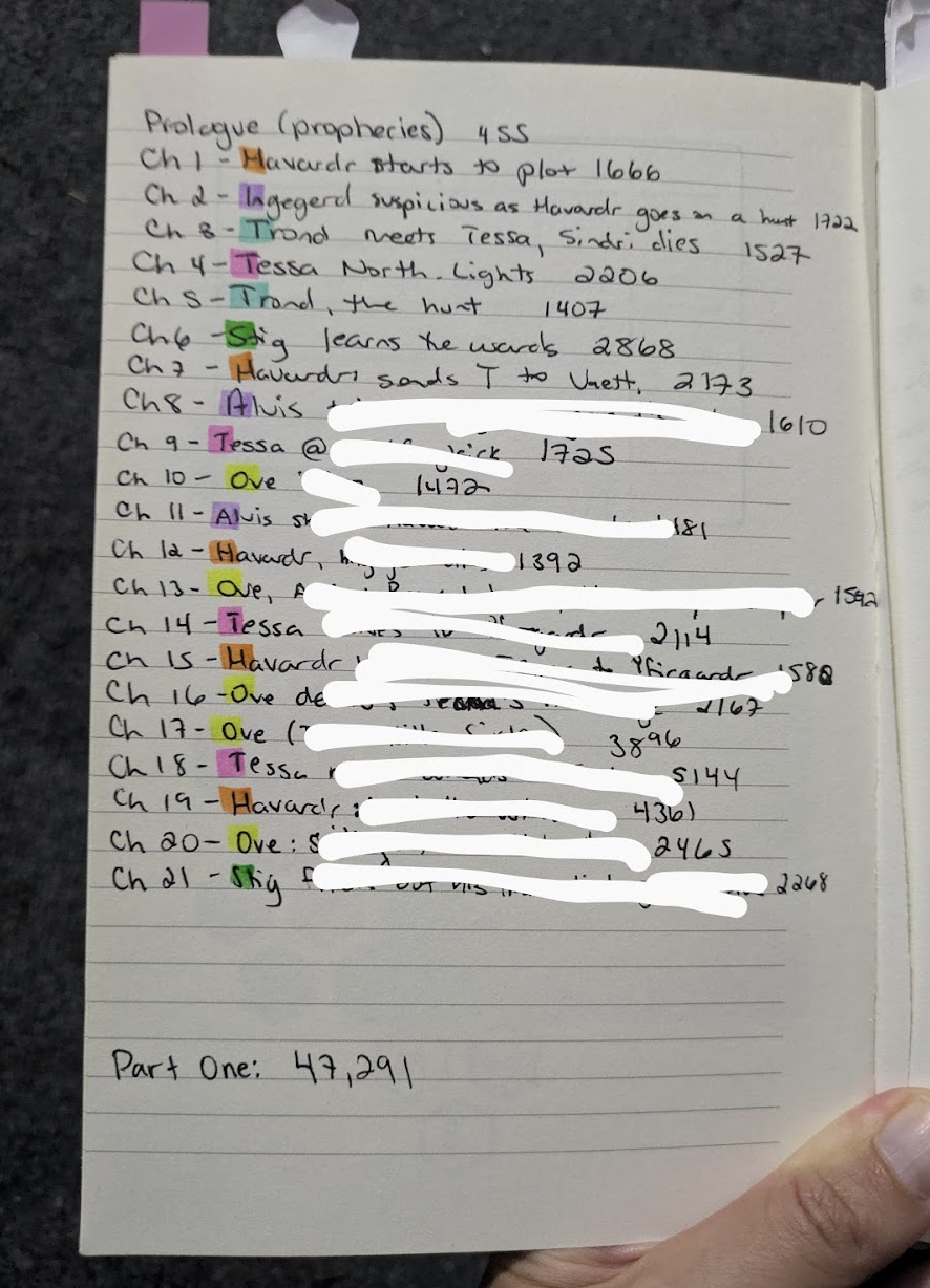 This journal page shows my current progress editing Tessa of Hundrfeld. I highlight the hexes as I go, but the outlines around different groups represent Part 1 and Part 2. Part 3 is almost done!