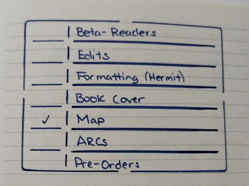 These are a lot of moving pieces that might be happening simultaneously. I know I have them framed as lists, but I’m necessarily going in that order. I don’t even have a completed draft of Drop the Gloves, but the cover is completed. Tessa of Hundrfeld has things like the map completed and edits underway, but the cover is a work in progress. The lists more give me a reminder of what I could/should be working on…and that satisfaction of checking something off as it’s completed.
