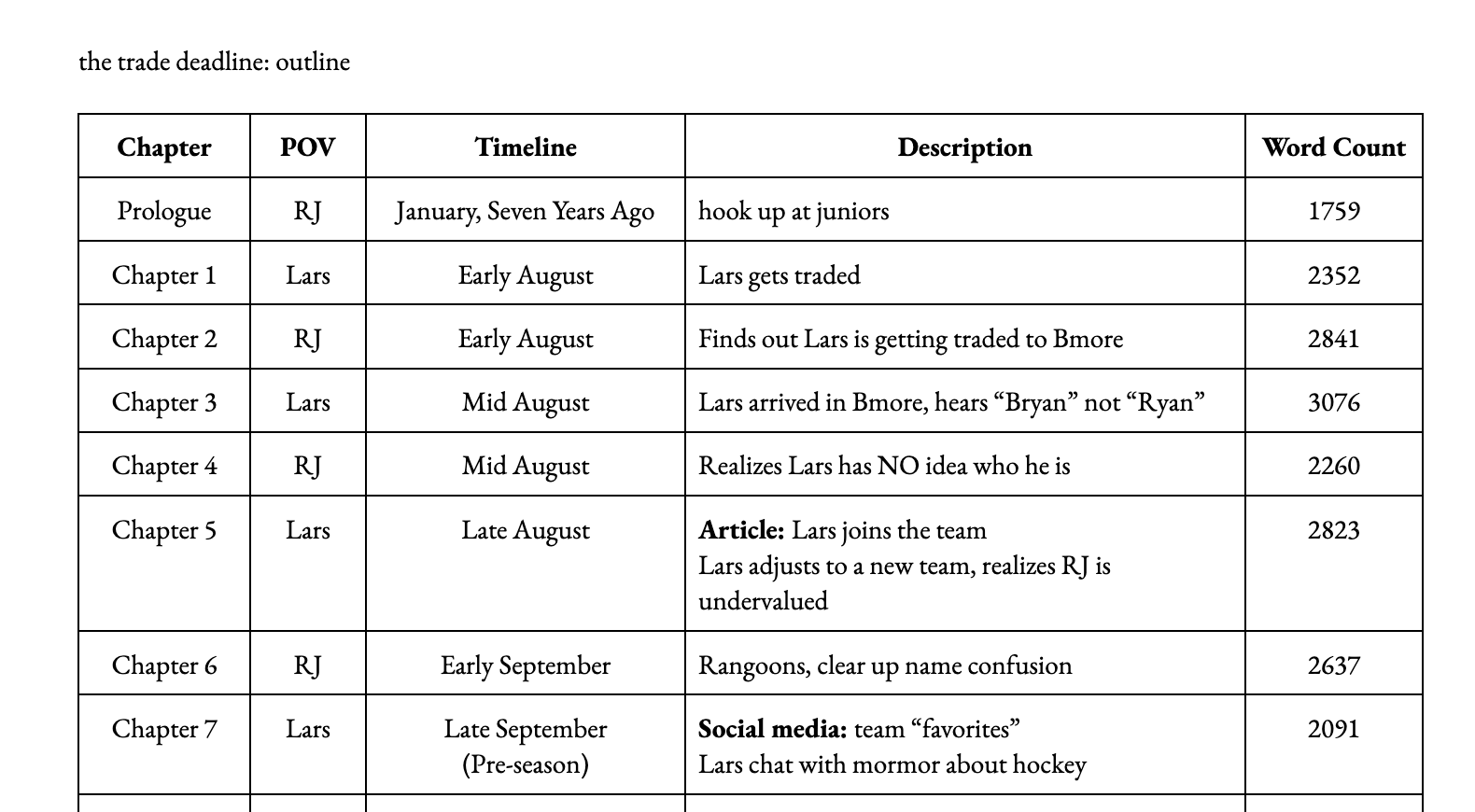 I remember when I went through Hockey Bois for the first time, there was a piece of the Jagr Bombs Christmas party with Gail that made zero sense for Gail’s character as I knew her. When I’d first written the scene, she was a side character I hadn’t really planned to do a whole lot with, but as I kept writing and she appeared more and more (thanks, Terry 😂), re-reading that scene had me cringing. Gail wouldn’t have said or done those things, she wouldn’t have put Brady on the spot the way she had, so that was a scene that needed to be completely reworked.