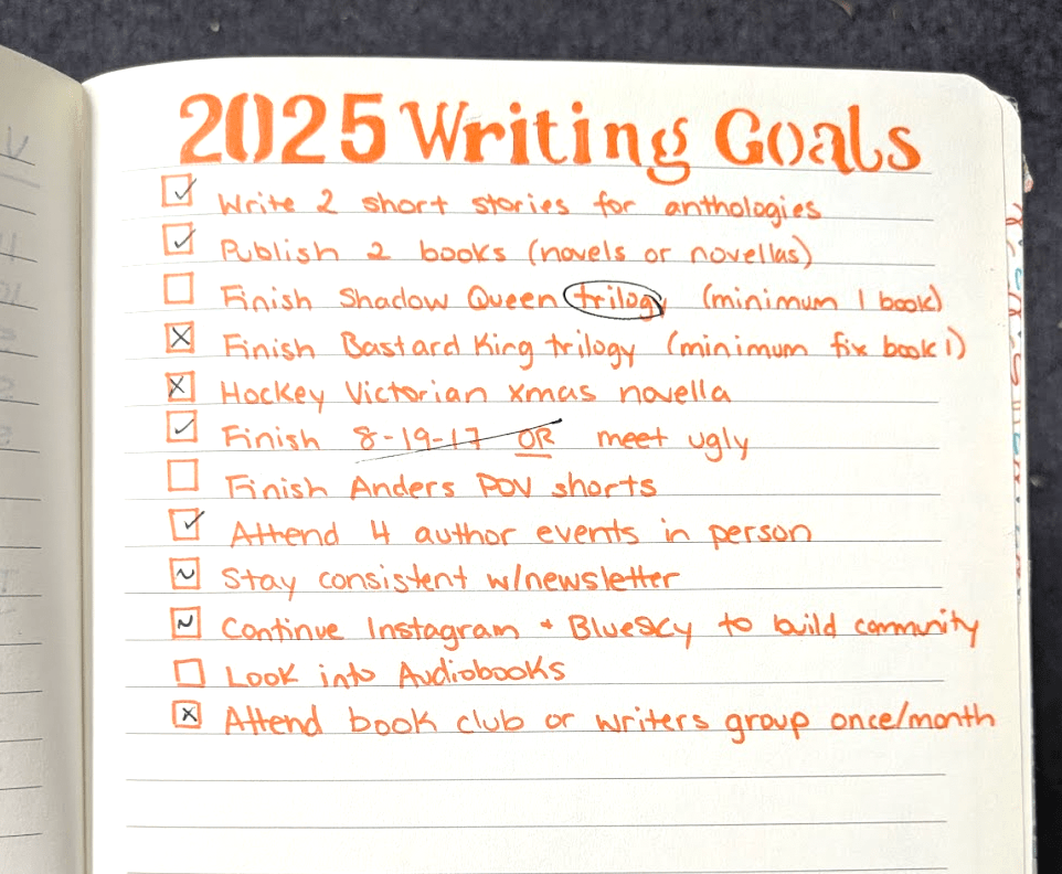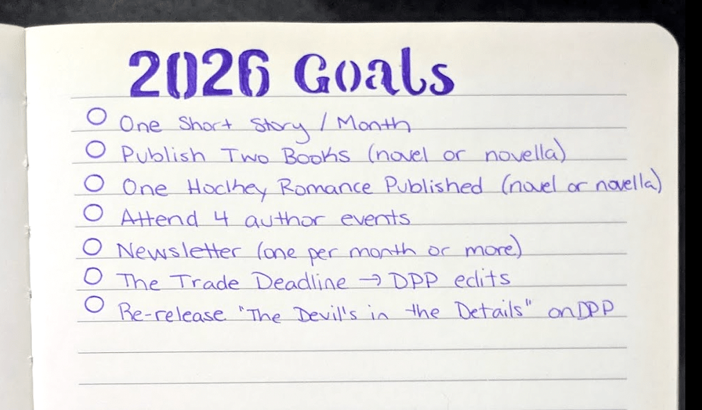 As an author, I think it’s important to set goals for myself, analyze my progress, and reflect so I can make adjustments. As I write this at the end of 2025, looking at what I’ve accomplished this year and how I hope to build off of what I’ve done into 2026, I thought I’d share this look into my goal setting process.