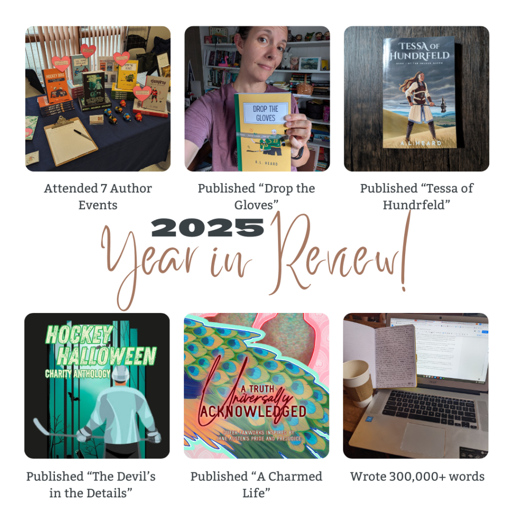 - Published 2 Books and 2 Anthology Stories: I started the year intent to build on my writing habits and momentum, and I feel like there was some definite payoff. I published two hockey romances – “Drop the Gloves” and the short story “The Devil’s in the Details” – and two historical fantasy stories – “Tessa of Hundrfeld” and “A Charmed Life.” And of course I wrote some short stories that pair with my hockey romances, all available on my itch.io 🙂
