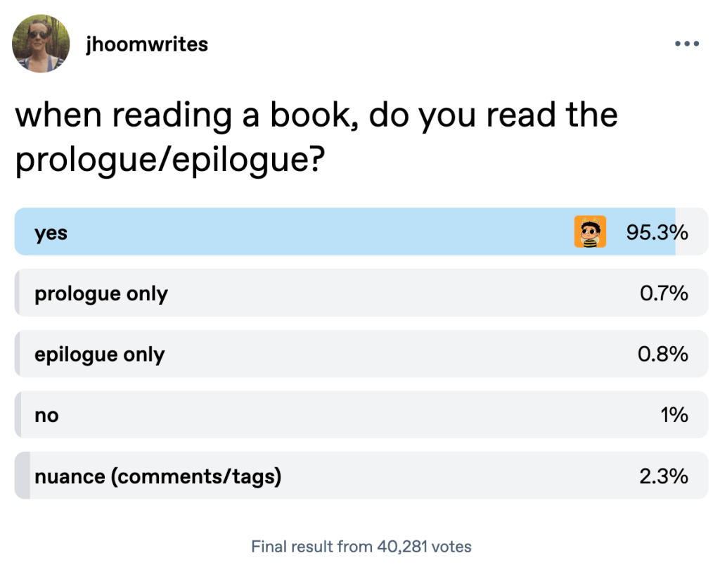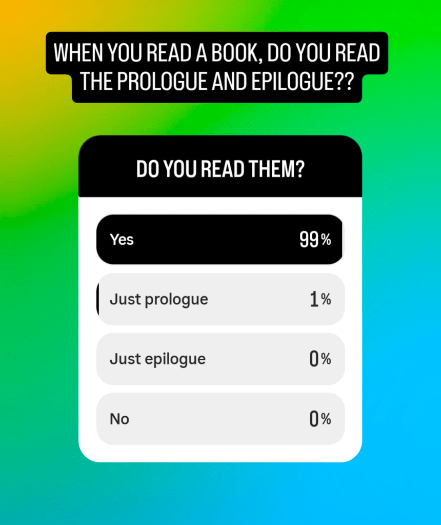 I conducted two polls, one on Instagram and one on Tumblr, asking if people read prologues, epilogues (both, just one or the other, neither). I tried not to bias it with my own opinion when I posted them, just the question and the options. I know there’s going to be some bias in my samples anyway, because I am an author posting in fandom and book circles, so my audience was going to mostly be readers. But that’s also kind of what I wanted – to know if people who read are indeed ignoring prologues/epilogues.
